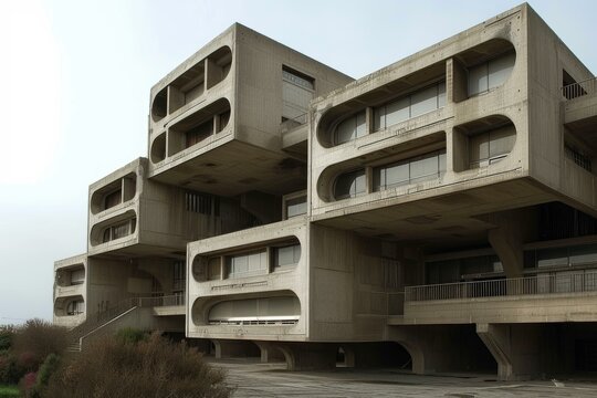 Abstract of concrete interior with sun light cast the shadow on the floor ,Geometric structure design,Museum space on mountains view background, Perspective of brutalism architecture