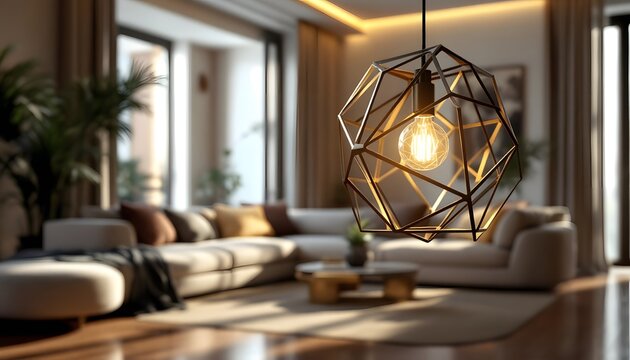 Ultra-realistic 8K shot of a modern geometric pendant lamp hanging in an elegant living room. The lamp has a sleek, metallic frame with angular lines, and its interior features a soft LED li