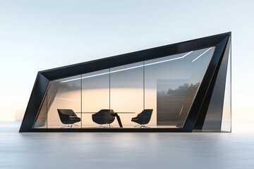 Abstract skyscraper exterior in evening light with angular lines, architecture, glass facade, modern