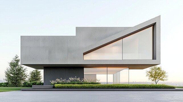 Angular 3D house with rooftop garden, concrete and glass materials, sunset, modern city living