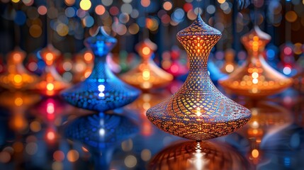Electron spin depicted as spinning tops with intricate patterns, representing their quantum angular momentum. Flat color illustration, shiny, Minimal and Simple,