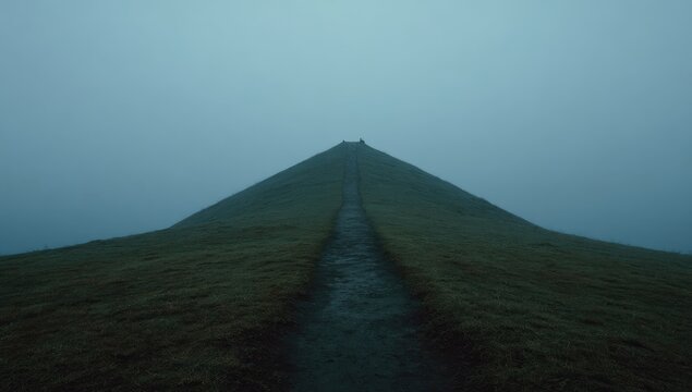 A stark, geometric concrete structure, triangular in design, stands alone in a bleak, open field under a cloudy sky.  A paved path leads to its recessed entrance