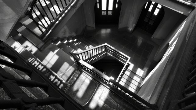 A monochrome staircase with a triangular handrail ascends towards a bright window, creating a symmetrical and illuminating indoor path in the midst of a bustling street