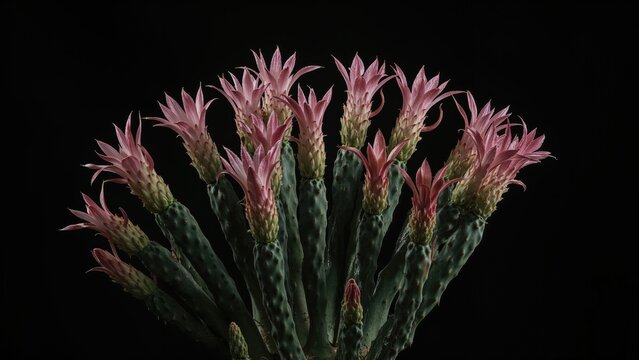 Disocactus anguliger cactus species with multiple stems displaying vibrant pink nocturnal flowers against a dark background