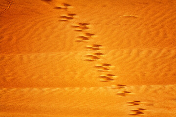 Wind-swept human footprints and animal prints in a waterless sand desert