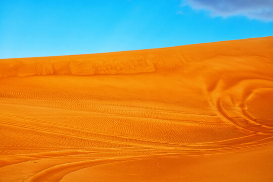 Hot deserts of southeastern part of the Arabian Peninsula. Orange barchan dune (inland sandhill areas, drift sands) in January. Sand hills are used by Arab motorists as an autodrome (amateur rally)