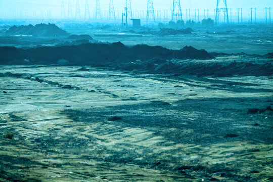 Building area in desert. New highway and high-tension power line. Iran