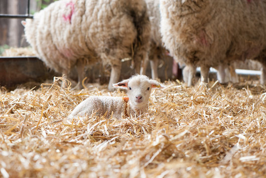 Tiny lamb sitting in a straw filled pen