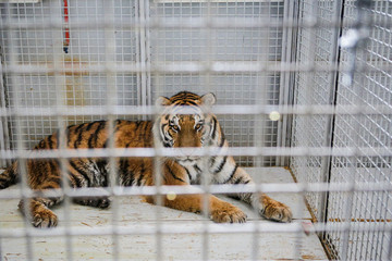 Wild Siberian tiger kept in cage inside a circus menagerie - animal abuse
