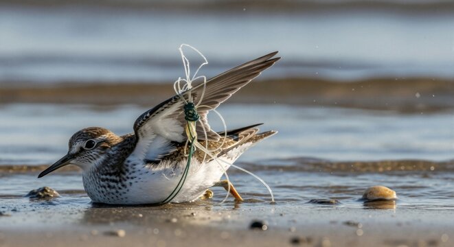 A small bird entangled in plastic fishing line on a beach. Wildlife in danger from ocean pollution. Environmental conservation and animal suffering concept