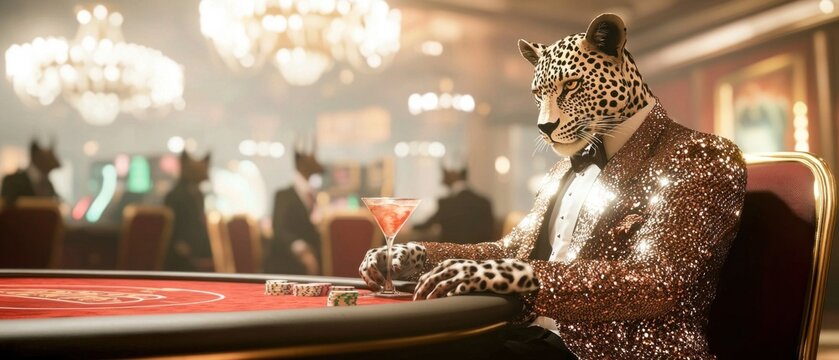 A stylish leopard in a sequined jacket enjoys a cocktail at the casino table - a unique scene of glamour and wildlife