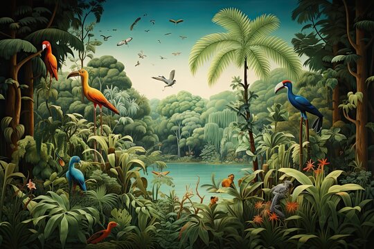 Tropical jungle with birds in the background - illustration for children, AI Generated