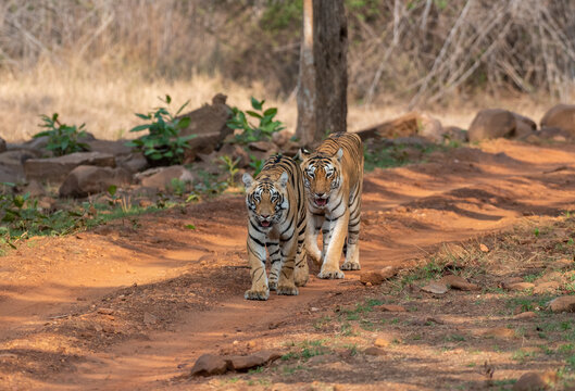 wild bengal female Tiger or panthera tigris tigris with tracking collar on neck pony or broken tail on prowl in outdoor wildlife safari at sariska national park forest alwar rajasthan india asia