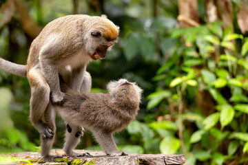Moment, Macaca or Male monkeys, female monkeys are make love and breed in the mating season in natural forest park with love and warm. Material for creative. Isolated background with transparent.