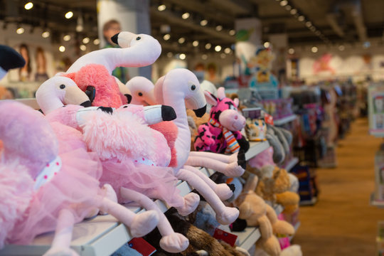 Pallets filled with various types of animal feed stacked in an indoor storage facility