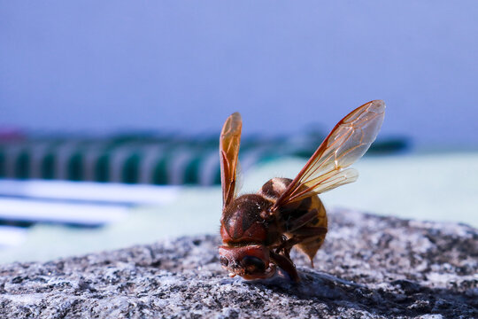 Primo piano di un calabrone visto lateralmente appoggiato su una piastrella di granito in giardino, animali e natura