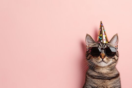 Cat with Party Hat and Sunglasses on Pink Background with Copy Space. Happy Birthday Concept.