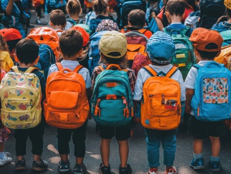 A group of diverse students and adults walking with backpacks, ready for school or work.