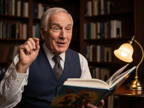 Elderly man in a library reading a book aloud with animated expression and gesturing