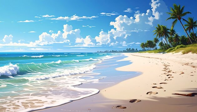 Animated shoreline scene. Crystal waves gently lap a sandy beach under a bright sky with puffy clouds and palm trees. Footprints mark the shore