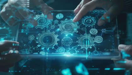 A network of gears and cogs animates behind a clear touch screen, depicting a team efficiently collaborating in realtime, Sharpen banner template with copy space on center