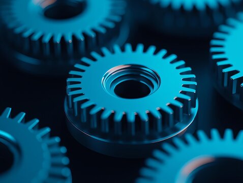 Close-up of interlocking blue gears and cogs for industrial machinery