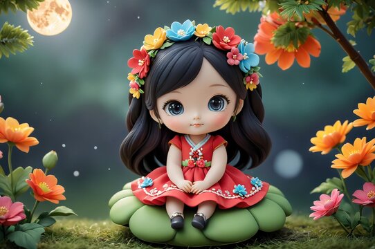 Cute little 3D doll in children's cartoon style, animated fantasy. Artistic background. Artistic illustration. Cartoon stylized illustrated art.