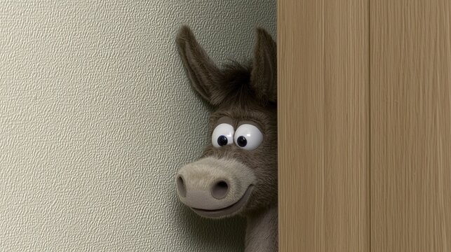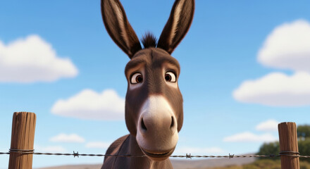 Close-up of a charming animated donkey with large ears and expressive eyes, looking directly over a barbed wire fence with a blue sky background