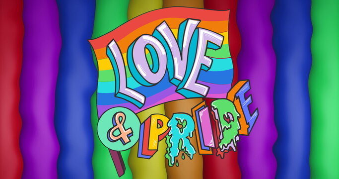Image of love and pride text over rainbow flag and stripes and colours moving on seamless loop