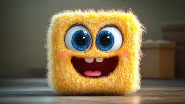 Cute fluffy yellow square character with big blue eyes smiling cheerfully indoors