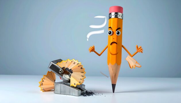 Animated pencil figure with angry expression, arms up, cartoon style. A broken point and a sharpener are present
