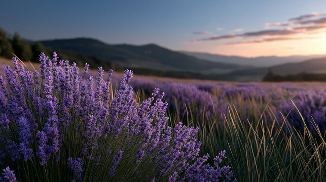 Peaceful 3D animated landscape loop of lavender hills at dusk with fluttering insects, dreamy sunset ambiance, and soft warm natural lighting for calm visuals, lavender animation, cinematic countrysid