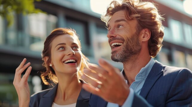 A cheerful couple sharing a conversation with animated gestures, showing excitement and happiness in their interaction