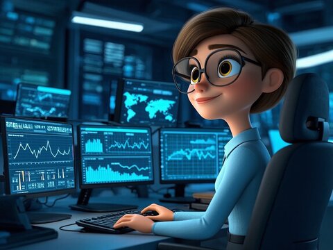 Animated analyst inputs data watching screens in dark office environment showing analytics