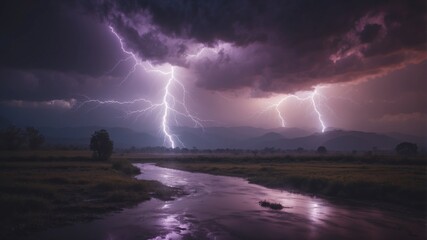 Violet night sky with dramatic lightning and storm clouds