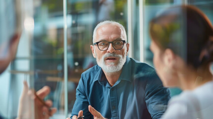 An elderly man converses animatedly with colleagues around a glass meeting table in a well-lit modern office.