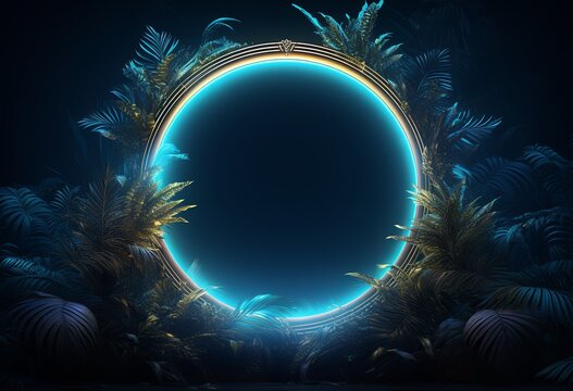 the illustration of a neon circular frame surrounded by leaves, in the style of uhd image, dark sky-blue, animated gifs, enigmatic tropics, unreal engine 5, i can't believe how beautiful.