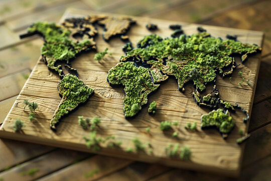 Render a 3D animated version of a world map with a focus on showcasing the beauty of greenery in different regions