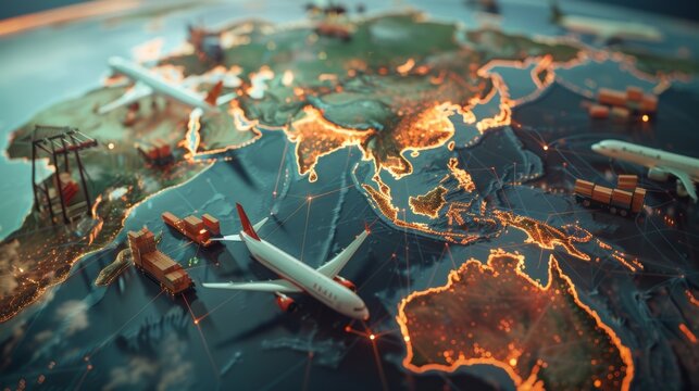 Global Logistics Network - 3D Rendered Map with Animated Transport Elements Highlighting Worldwide Shipping Routes