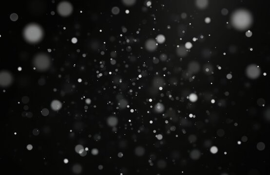 Isolated falling snow overlay on night sky. Defocused blurred snowflakes bokeh design. White snowstorm glitter particles, winter holiday festive decoration on dark black wallpaper background.