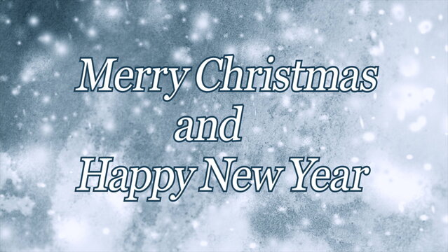 Merry Christmas and Happy New Year words letters design on paper background with white and blue spots and animated snow. Text background backdrop.