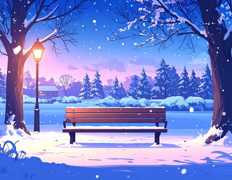 Animated depiction of a charming teddy bear wearing a warm orange scarf, set amidst a snowy winter forest with falling snowflakes and stylized evergreen trees in a serene, inviting environment under
