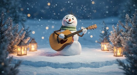 Whimsical christmas scene with snowman and trees