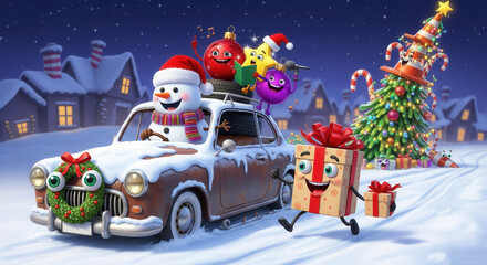 Funny winter Christmas illustration of snowman driving car while animated ornaments and gifts run beside a glowing Christmas tree