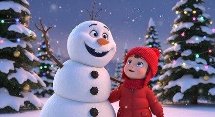 Joyful Animated Snowman with Colorful Scarf and Cheerful Eyes in a Futuristic Snow Landscape Under a Bright Rainbow