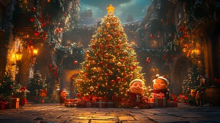 Whimsical Christmas tree decorating with animated characters adding ornaments and enjoying festive music