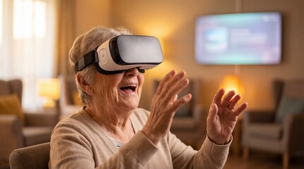 An elderly woman's immersive journey in virtual reality, as her expressive face and animated hands showcase her full engagement in the virtual world. She wears the VR glasses with a radiant smile.