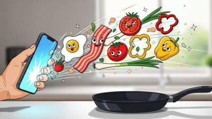 Cartoon Breakfast Ingredients Emerging from a Smartphone into a Pan.