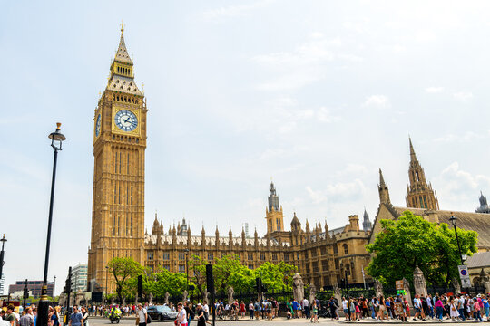 Angleterre Londres Vue de Big Ben et du Palais de Westminster, Elizabeth Tower et Parlement britannique sous un ciel clair, foule et animation urbaine touristique