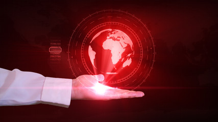 A businessman is holding a hologram of planet earth in his hand. Futuristic interface